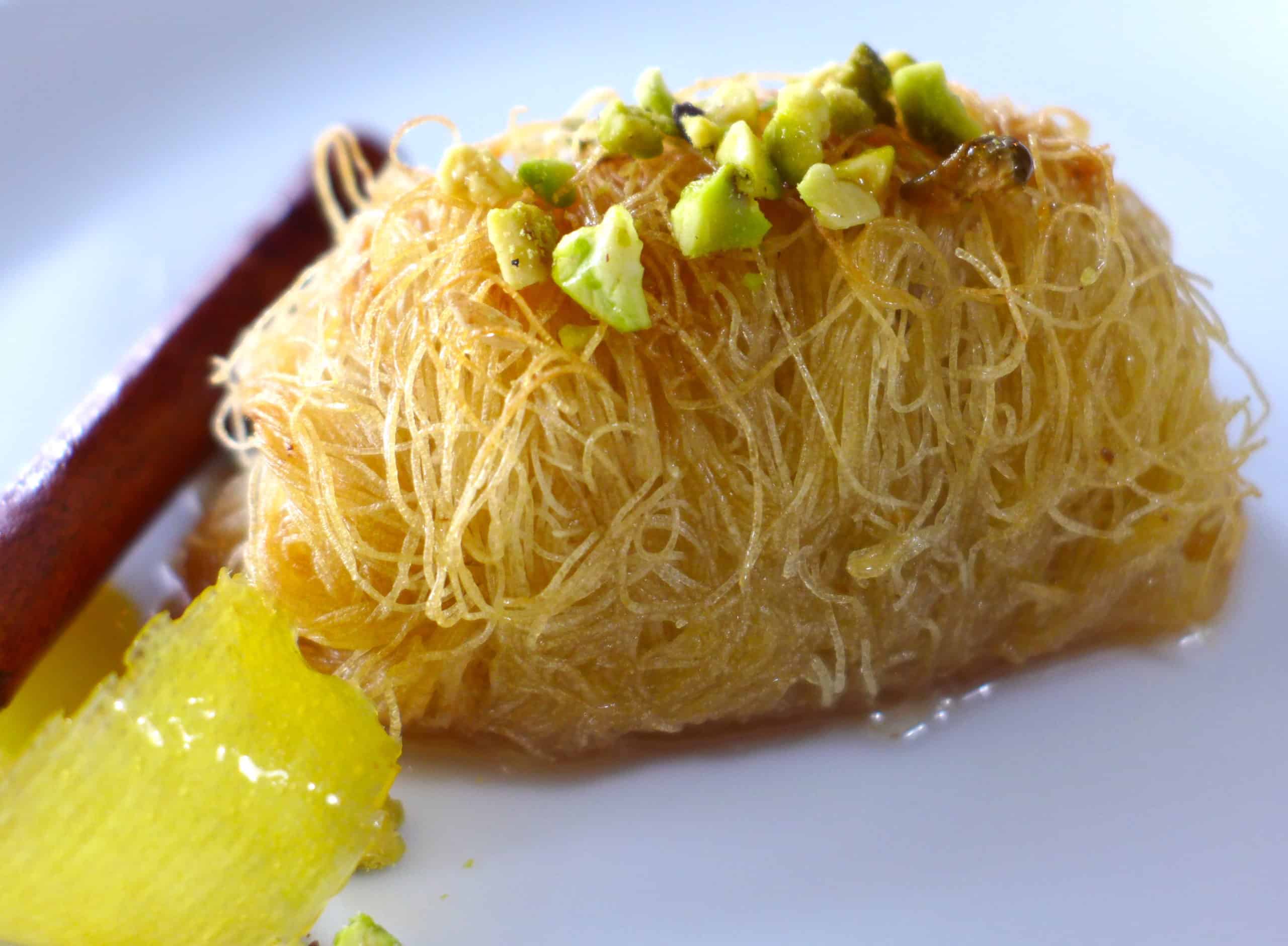 cripsy kataifi dough and bathed in lemon scented syrup.. Simply